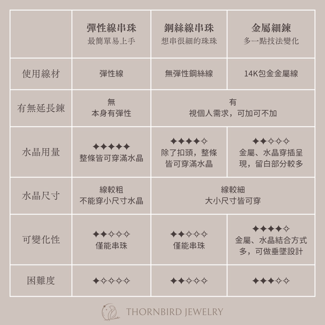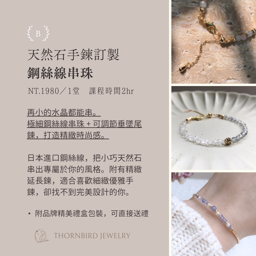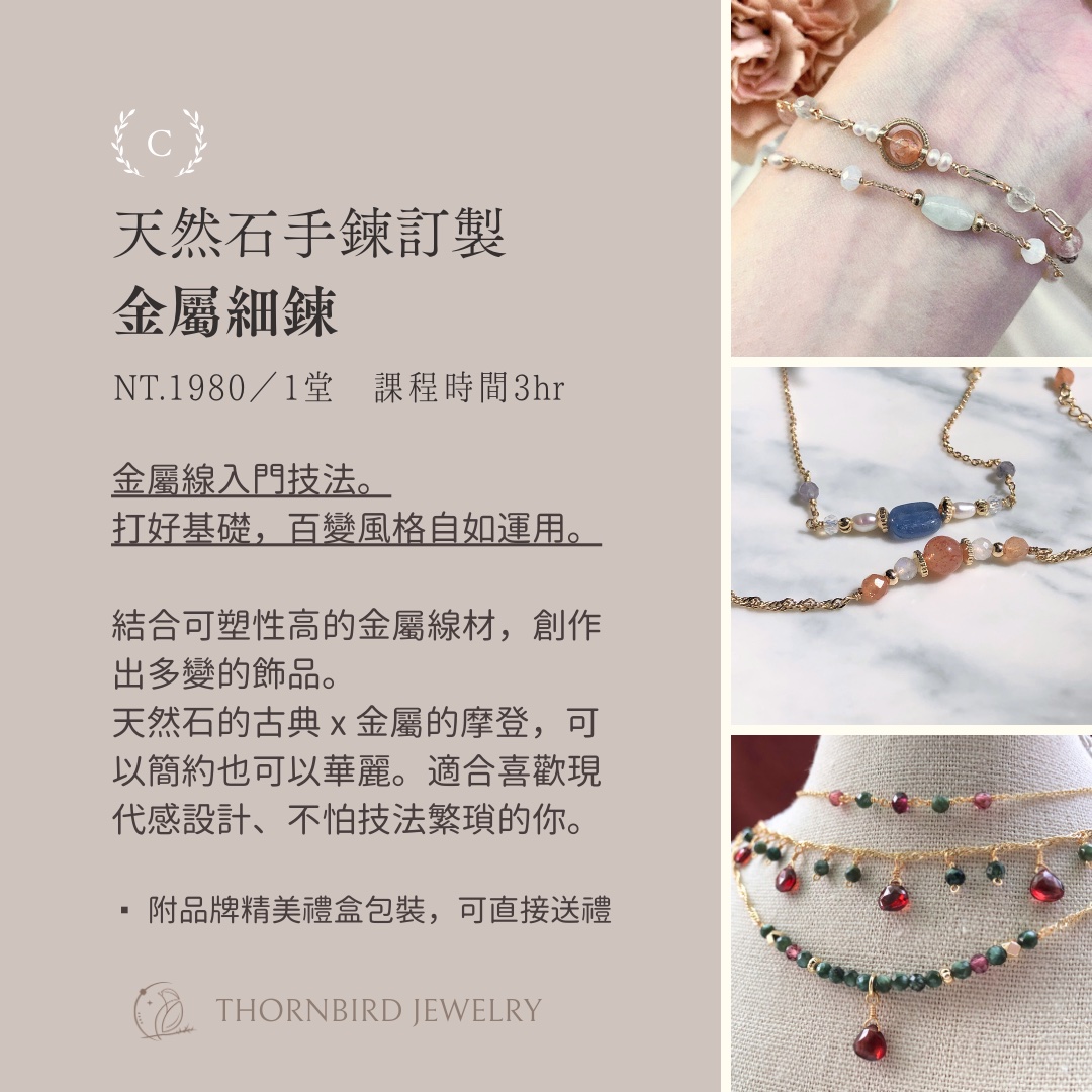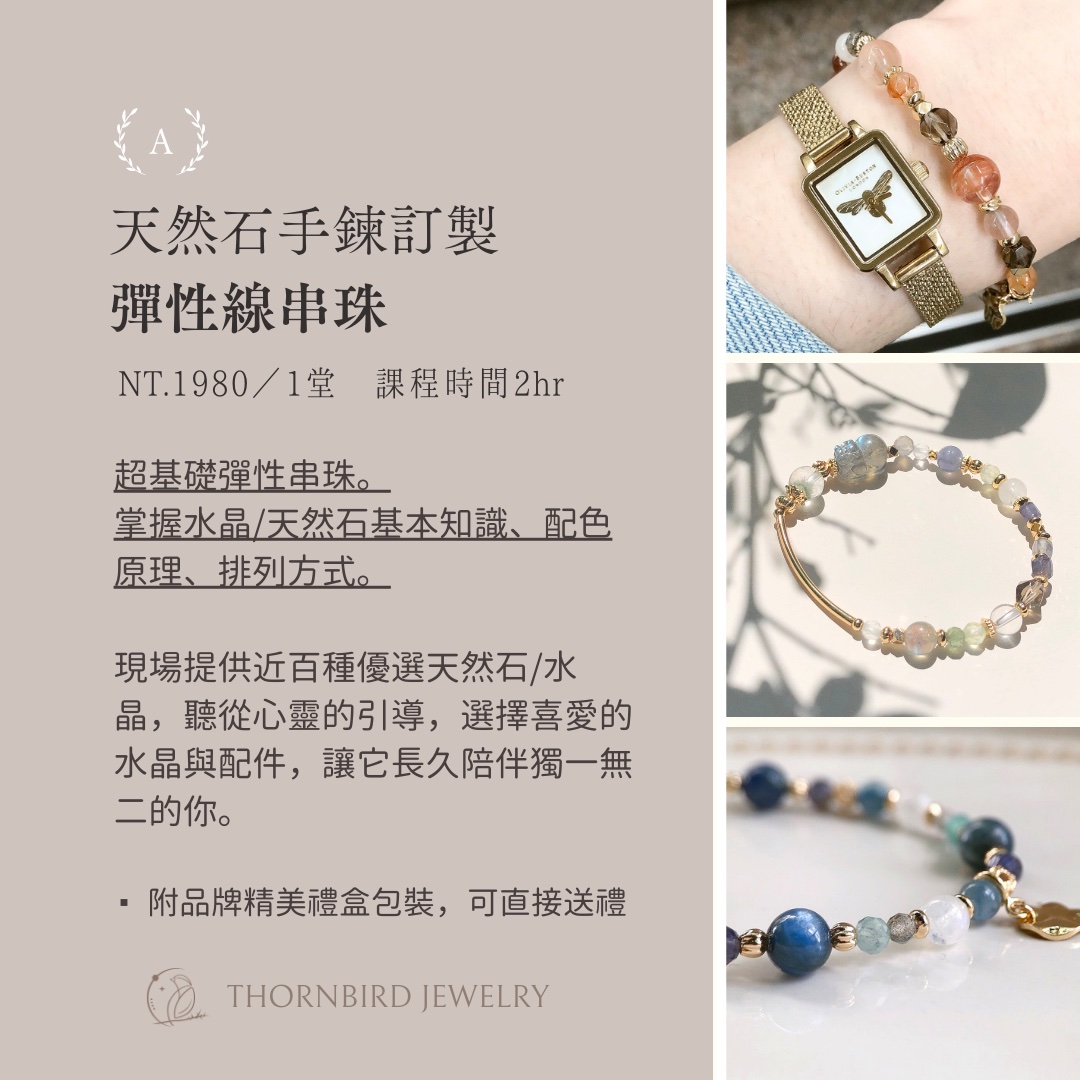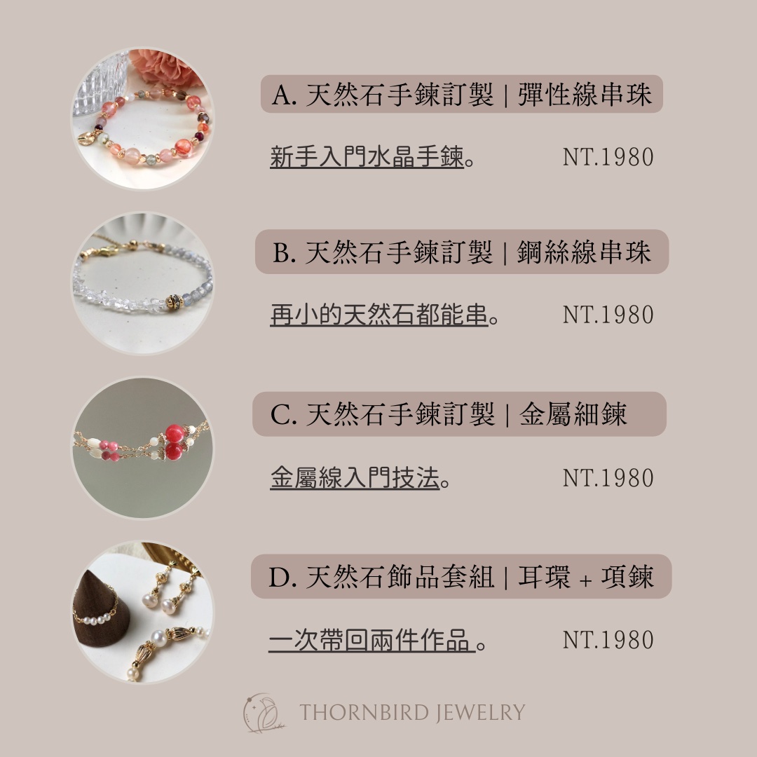 從0到1,完成你的第一件手作飾品。提供 100 多種天然石/水晶,為自己設計獨一無二的飾品。基礎技法,千變萬化,初學者也能簡單上手。