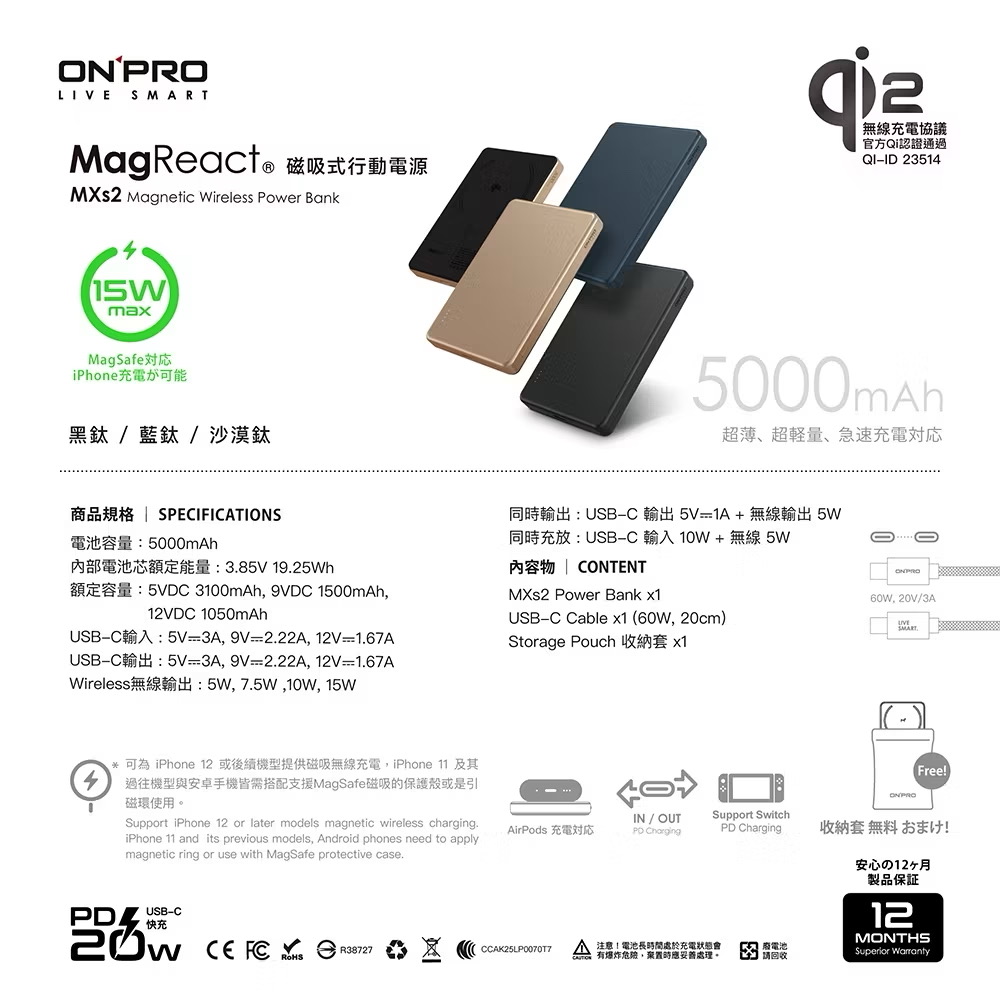 ONPRO MagReact MXs2磁吸式行動電源 [5000mAh]