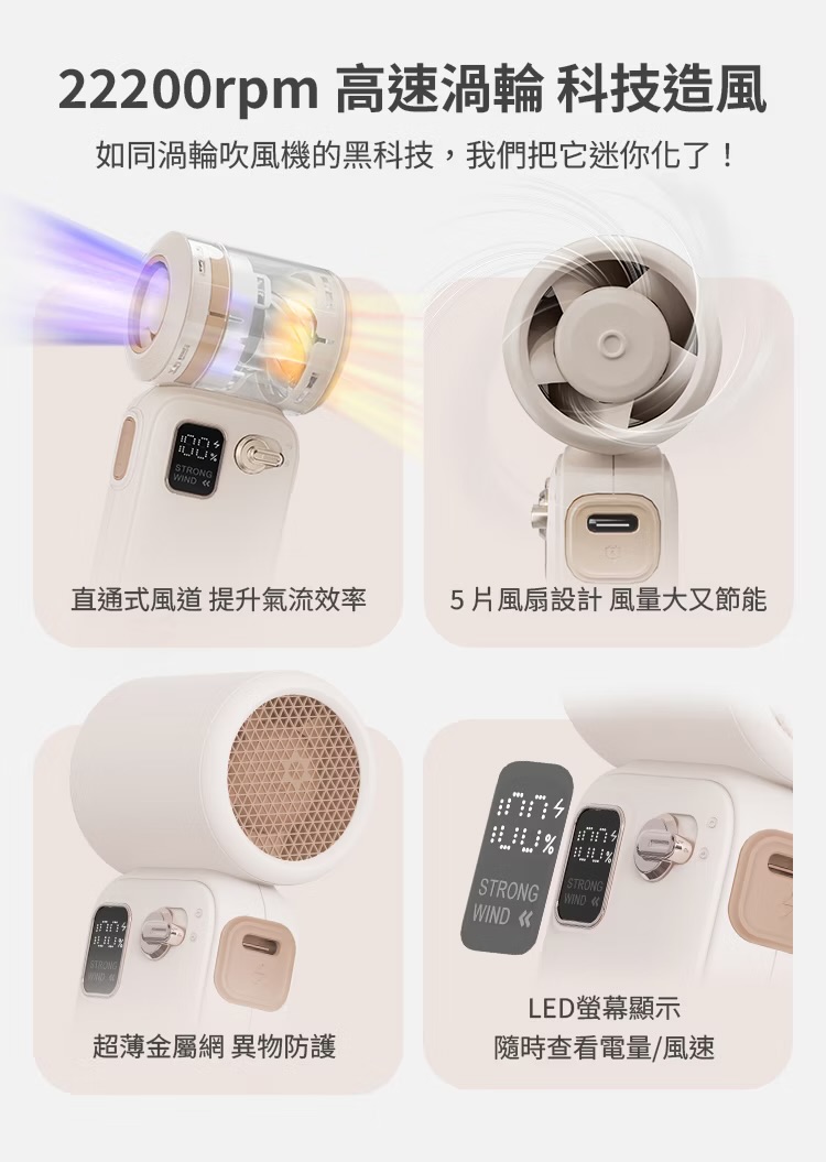 【LaPO】迷你渦輪隨身高速風扇 13cm 極輕158克 日本松下電芯 5100mAh 電量顯示 百段風速 LF-02