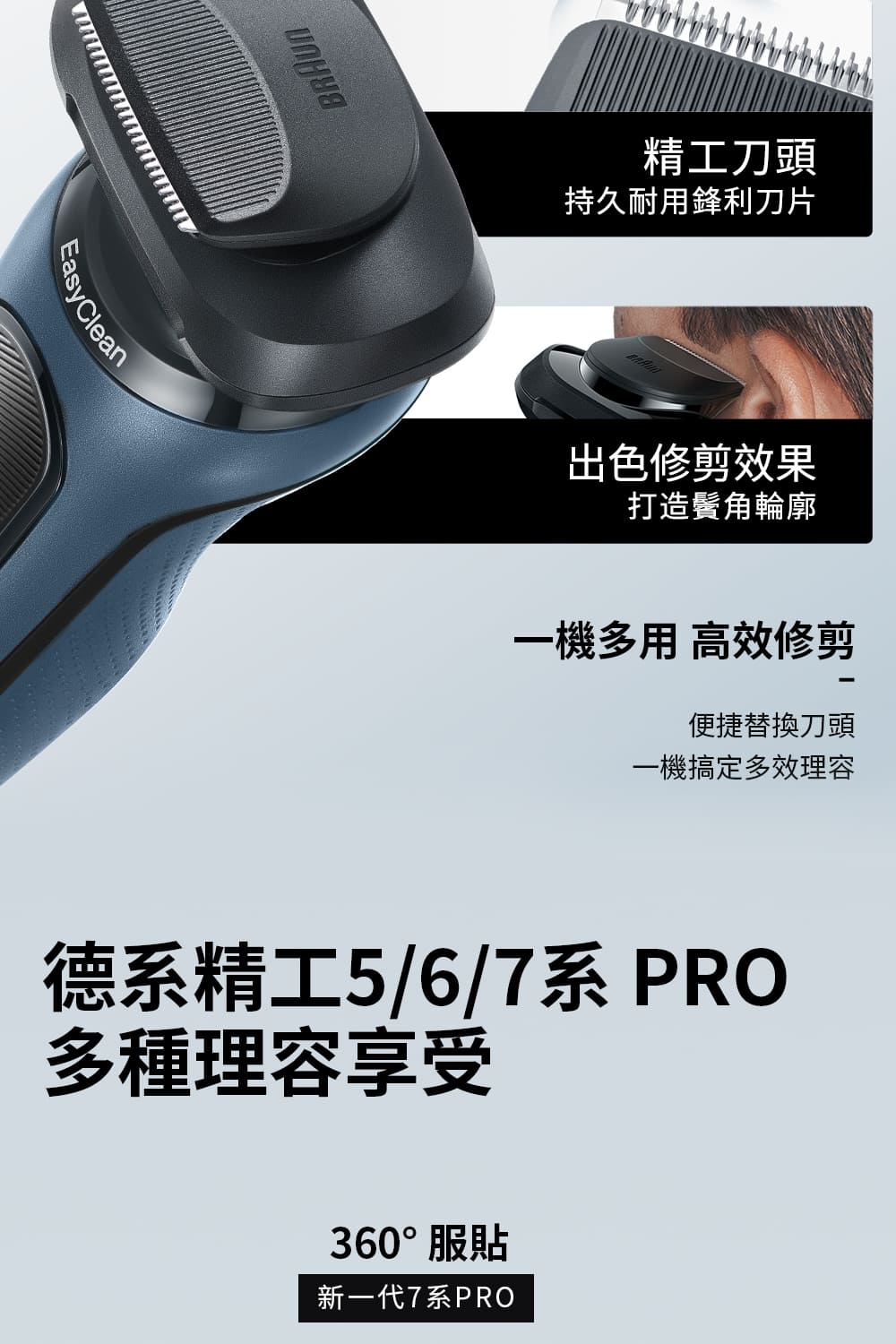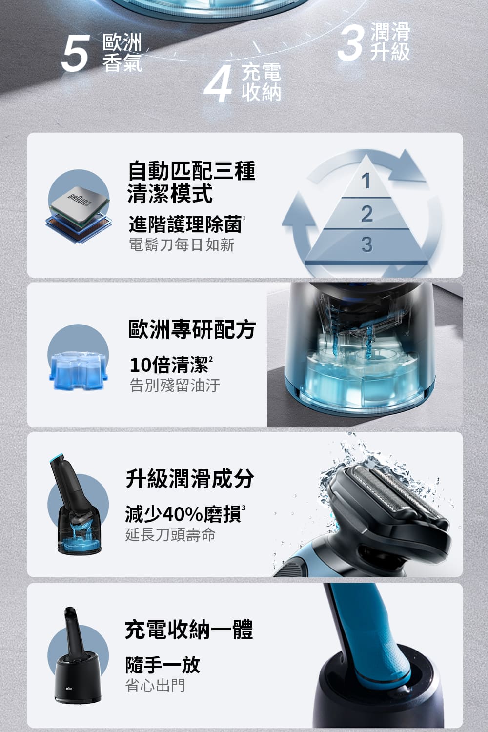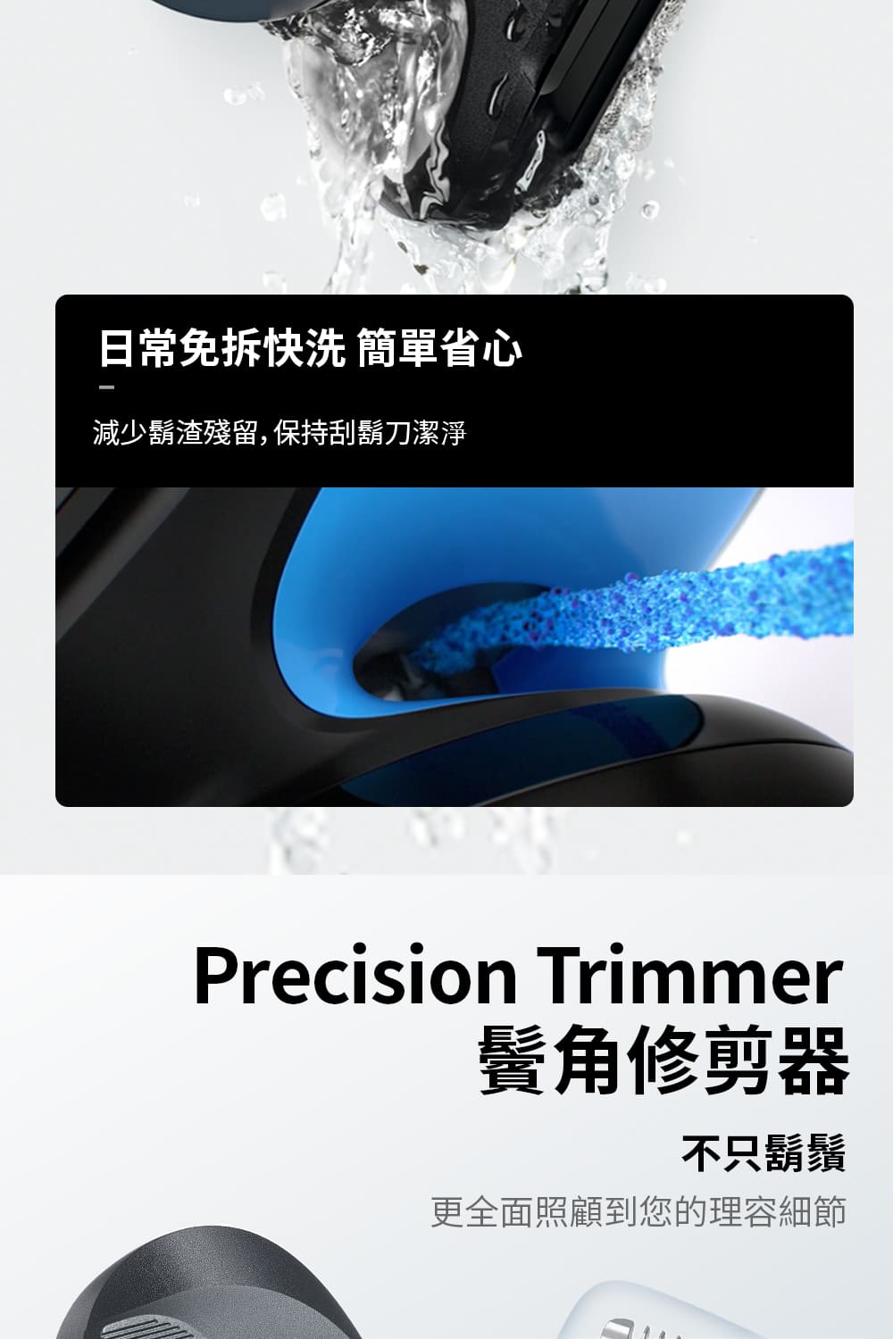 配件:保證書/中文說明書/自動清潔充電系統/清洗液/清潔刷/電源插頭/刀頭保護蓋/鬢角刀配件/造型修容配件