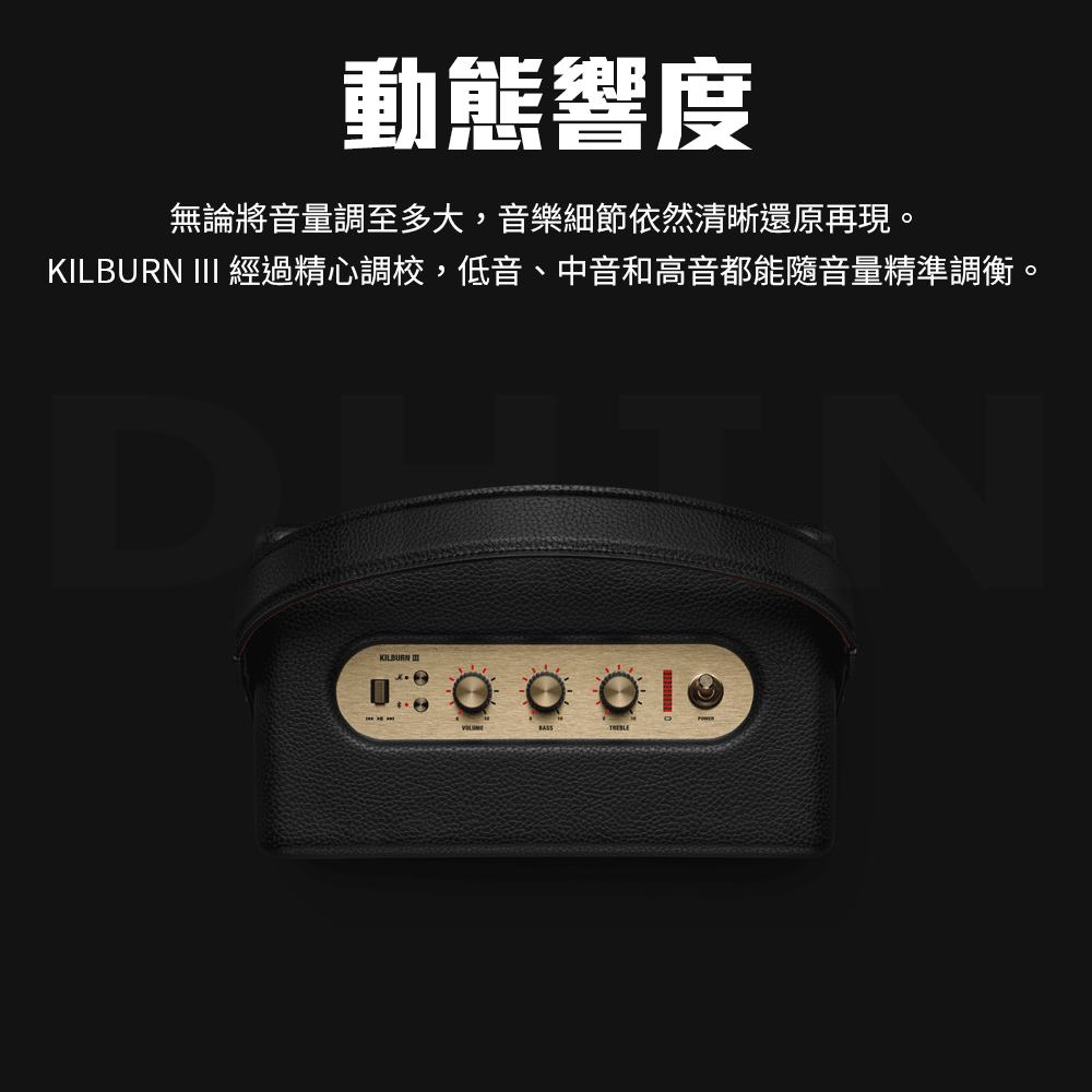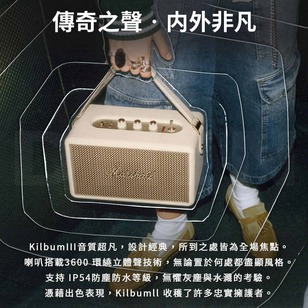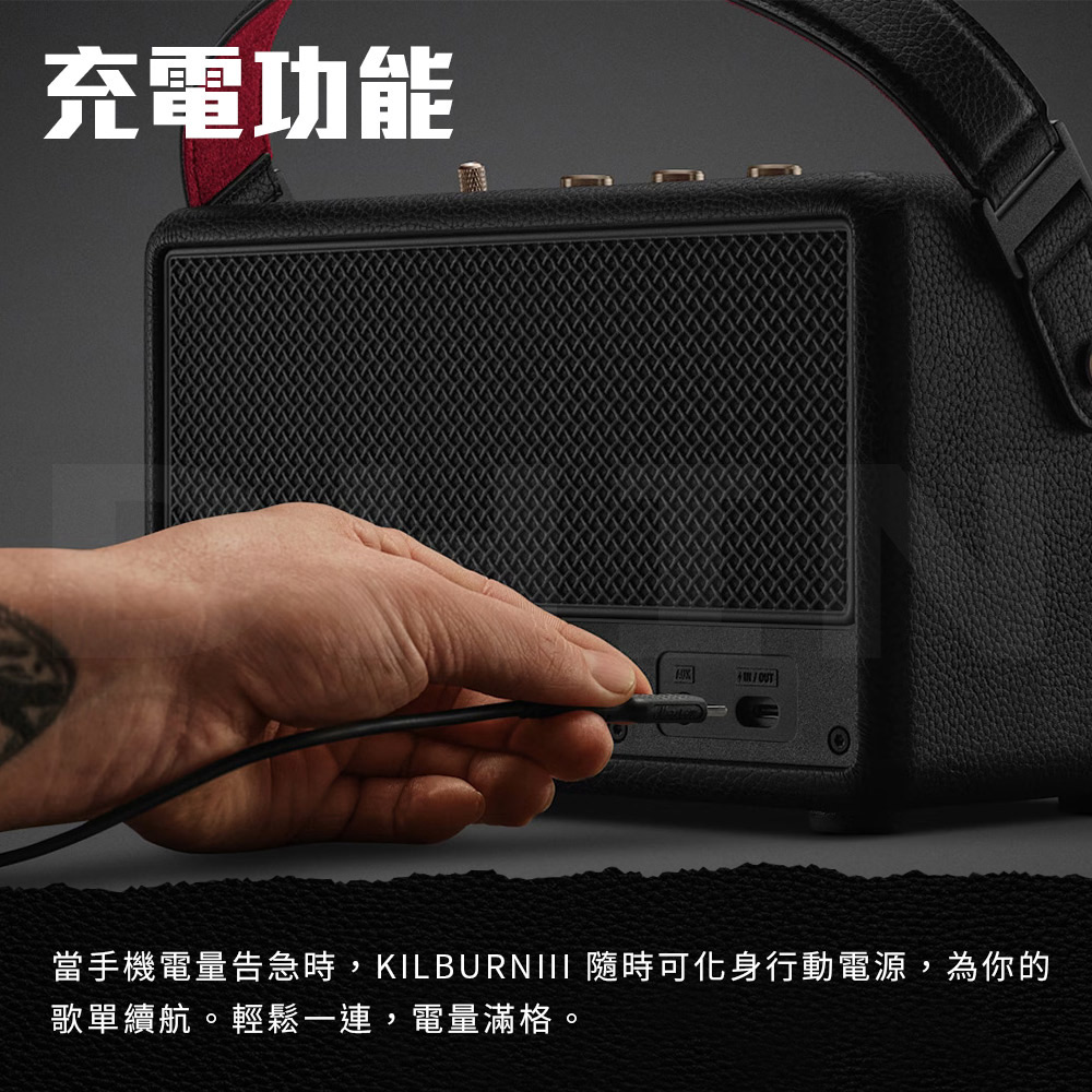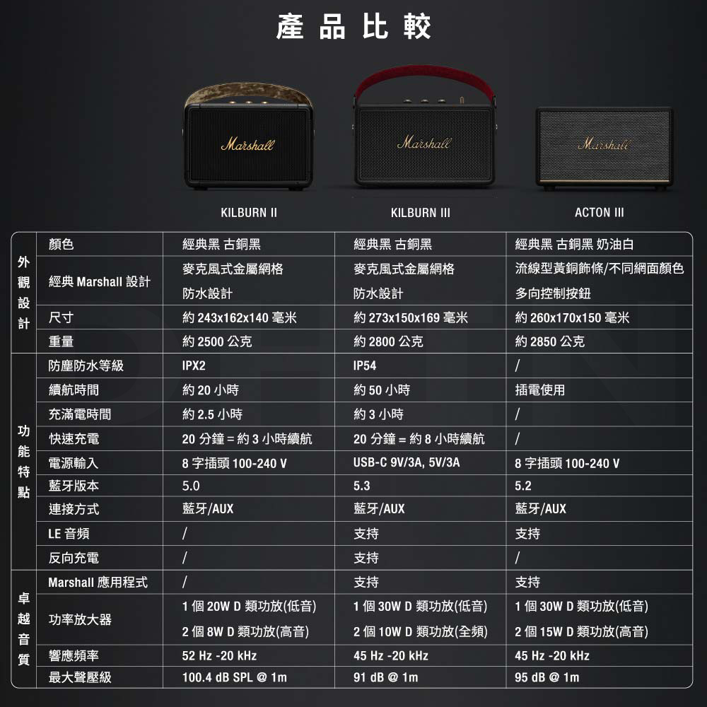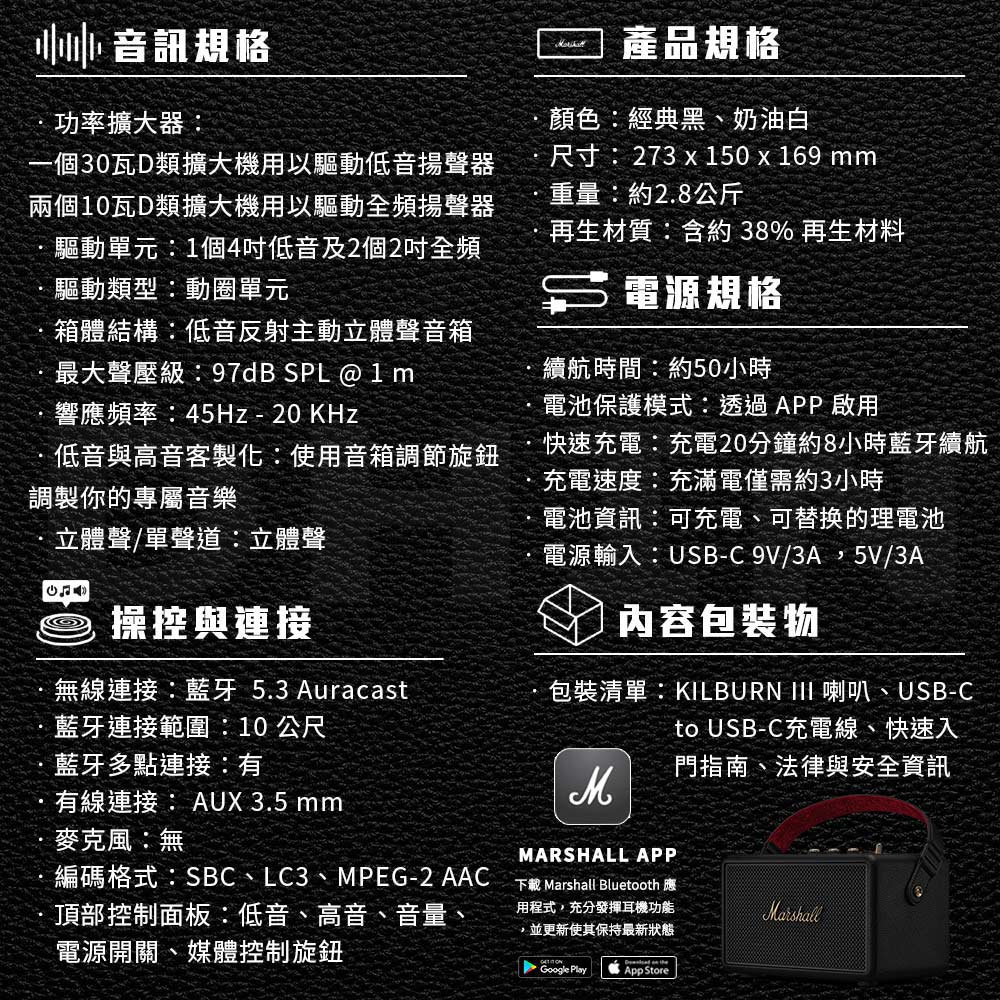 .包裝清單:Kilburn III 喇叭、USB-C/USB-C 充電線、快速入門指南、法律與安全資訊